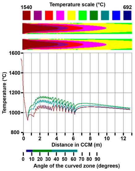 Figure 8a shows the corresponding surface temperature of each billet surface [23,24]. The simulation includes the curved region of the CCM to appreciate details of the non-symmetrical temperature profiles. The close-up of Figure 8b illustrates the influence of different spray disposals along the casting direction.
