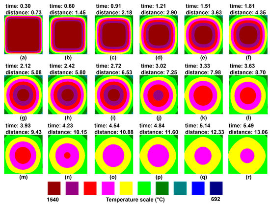 Although the CCM is symmetrical, different surface temperatures resulted after the analysis due to different applied heat fluxes to each billet face. Figure 14 shows a set of perpendicular or top views. Here, it is possible to observe that only one single curve is inside the mold due to applying the same heat removal on the four billet surfaces, as shown in Figure 14a,b. The non-symmetric profiles emerged when the billet was in the SCS from Figure 14c–r. The isothermal regions changed to rotated squared profiles because of the uneven heat removal rates applied at short distances on the billet surfaces. Moreover, some profiles tended to adopt the same hyperbolic form inside the billet core, like those shown in case 1.
