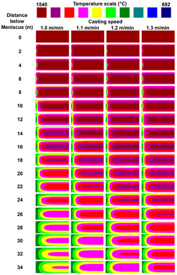 The temperature profile shown in Figure 1 results after applying uniform heat removal conditions to the four billet surfaces. Here, the isothermal zones are symmetrical in each direction. The geometry of the solidification front goes from quasi-squared-linear faces to the billet corners and surfaces, and then to a circle in the billet core [26,28,29,30,31]. Nevertheless, this profile is related to an ideal heat removal which is the most straightforward simplified assumption for the heat removal problem. However, there is a need for differential heat removal conditions on each billet surface due to the fluctuation of the water flow rate and water temperature [6,11,26,27,28,29] acting on each surface. Other needs of cooling control is to decrease segregation levels [32], use appropriate heat transfer coefficients [33], use dynamic spray cooling, and use temperature monitoring [34,35,36,37,38]. In addition, many operational problems arise during casting operations, such as a non-homogeneous supply of the water on the billet surface, the boiling heat transfer mechanism of water close to the cold mold face, and the bent or plugging spray nozzles. Thus, defining features and boundary conditions permit special heat removal conditions [39,40,41,42,43].