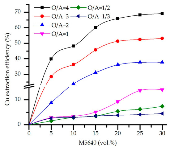 Copper extraction efficiency as a function of M5640 concentration and O/A phase ratio for the feed pH 0, temperature 20 °C, and contact time 10 min.