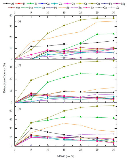 Effect of M5640 concentration and O/A phase ratio 4 (a), 3 (b), and 2 (c) on extraction efficiency for the feed pH 0, temperature 20 °C, and contact time 10 min.