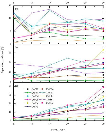 The separation coefficient (Figure 3b,c) shows significant differences comparing O/A = 3 and 4 ratios, but only at the upper M5640 concentration limit, which, as previously established, has not contributed to Cu extraction efficiency. For M5640 up to 20 vol.%, better separation is achieved for O/A = 3 ratio.