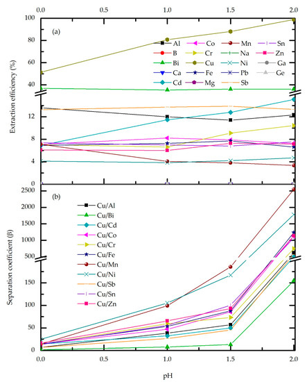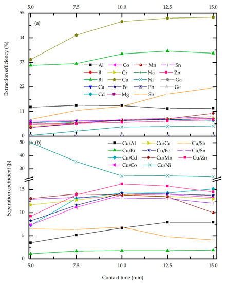As can be seen from Figure 4a, the extraction percentage generally rises with contact time. For the majority of trace metals, as well as for the most abundant impurities (Ni, Sn, Fe, and Zn), the change in extraction efficiency is negligible. Moreover, prolonged contact time does not affect the extraction of B, Ca, Na, Mg, Pb, Ga, and Ge, which remain in the raffinate. The extraction percentage of Sb sharply rises after 10 min of phase contact from 13.2% to 21.65%, indicating slow extraction kinetics, while at this time point, Cu and Bi reach the plateau. These results can be explained by the strong binding capacity of Cu-M5640 comparing to the other metals, leading to increased extraction until equilibrium is reached. After that point, the extraction of impurities rises. As shown in Figure 4b, the separation coefficient is influenced by phase contact time until the equilibrium of each metal is achieved, which for most of them is around 10 min. Considering the contact time effect on the metal’s behavior during extraction, the mentioned time point of 10 min makes a breaking point, and thus is it is chosen as the optimal one.