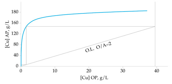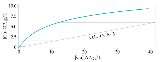 In order to determine the number of the extraction stages, a correlation diagram between metal content in the organic vs. aqueous phase was plotted. The Cu extraction isotherm was constructed according to the experimental results obtained by various O/A ratios maintaining extractant concentration, phase contact time, feed pH, and temperature constant. A McCabe–Thiele diagram (Figure 6) was constructed assuming that the concentration of the Cu in the organic phase was 0 g/L. Results show three theoretical stages needed to achieve quantitative copper extraction.