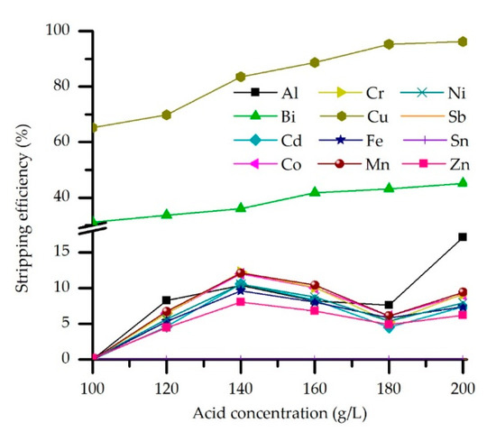 However, the selectivity of Cu stripping is hindered by Bi, which is co-stripped up to 45%. On the other hand, Sb and Sn cannot be stripped under described experimental conditions and remain in the organic phase. Stripping efficiency of other trace metals and Fe, Zn, and Ni, was under 15%. The predominance of the Cu in the organic phase and affinity in the metal-An-H+ system could explain obtained results. Namely, under optimal extraction conditions, the loaded organic phase contains 36.5 g/L Cu and significantly less metal impurities: 1.6 g/L Zn, 1.9 g/l Fe, while Ni, Sn, and Bi are measured in ppm 415, 31, and 41, respectively. The concentration of other metal impurities is under 30 ppm. According to the results, 180 g/L H2SO4 is chosen as the optimal concentration of the stripping agent and thus applied in the subsequent experiments.