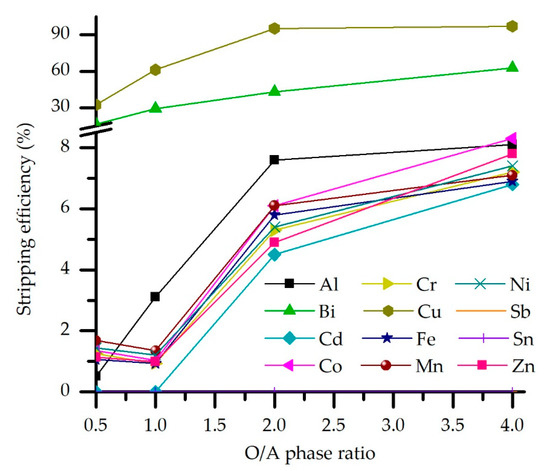 Another set of experiments were conducted to determine the O/A ratio effect on the stripping efficiency. As before, all other process parameters were kept constant. Results are shown in Figure 8. Accordingly, the O/A ratio effect on Cu and Bi stripping efficiency has a negligible effect on trace elements and Fe, Zn, and Ni. Copper stripping efficiency sharply rises to O/A = 2, after which only a slight increase is observed, from 95.3 to 97.2 %S, while Bi co-stripping almost linearly increases in the whole experimental O/A range. Meanwhile, other impurities are stripped up to 8% by the upper O/A range limit.