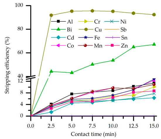 In order to determine the effect of contact time on the stripping efficiency and selectivity, this parameter is varied in the 2.5 to 15 min range. In contrast, other parameters were constant, following previously determined optimal values. Results (Figure 9) indicate that prolonged contact time leads to an increase in the percentage of impurities stripped from the loaded organic phase, especially in the case of Bi, whose stripping efficiency generally rises from 44% to 67% within the studied time range.