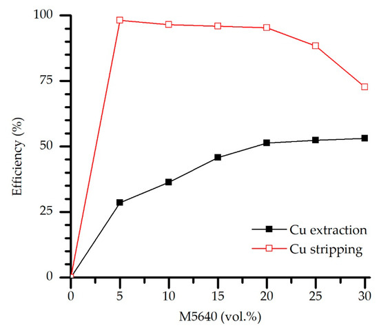 The loaded organic phase of different extractant concentrations was used as metal feed, and Cu stripping experiments were conducted under previously defined optimal conditions (O/A = 2, 180 g/L H2SO4, contact time 5 min, and temperature 20 °C). Results shown in Figure 10 indicate hindered stripping, as reflected in the decrease of stripping efficiency (from 95.3 to 72.6%) for experiments of extractant concentration (M5640) above 20 vol.%. This can be explained by elevated extraction efficiency when the extractant concentration is above the mentioned value due to pronounced Cu-M5640 binding affinity and increased Cu abundance in the organic phase. Such stripping results favor the previous experimentally defined optimal extractant concentration.