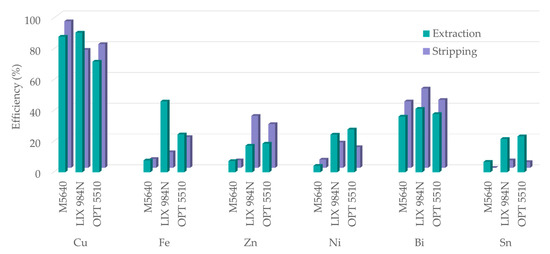 In order to select the most efficient extractant for copper extraction from a complex system, a series of experiments were conducted using, in addition to M5640, two other commercial extractants: LIX® 984N (often used for Cu extraction from sulfate solutions) and OPT 5510 (an extractant modified to facilitate Cu extraction and stripping). According to the obtained results, all three studied reagents show high Cu extraction efficiency (Figure 12). However, although the highest Cu loading was achieved with LIX® 984N, so was impurity co-extraction, especially with Fe, which reaches almost 50%. Co-extraction of Zn, Ni, Bi, and Sn is significant, both with LIX® and OPT. Moreover, selectivity is achieved only by M5640. As for the extraction, the subsequent stripping step also shows favorable Cu results for all three studied reagents, with slightly promoted stripping from loaded M5640. However, the co-stripping of impurities from loaded LIX® 984N and OPT 5510 is elevated, showing poor selectivity towards Cu. In addition, under applied experimental conditions, Sn cannot be stripped from the loaded M5640, yet for the other two extractants it is up to 5%. The trace metals impurities follow a similar trend of increased extraction with LIX® 984N and OPT 5510 for both SX process steps (not shown).