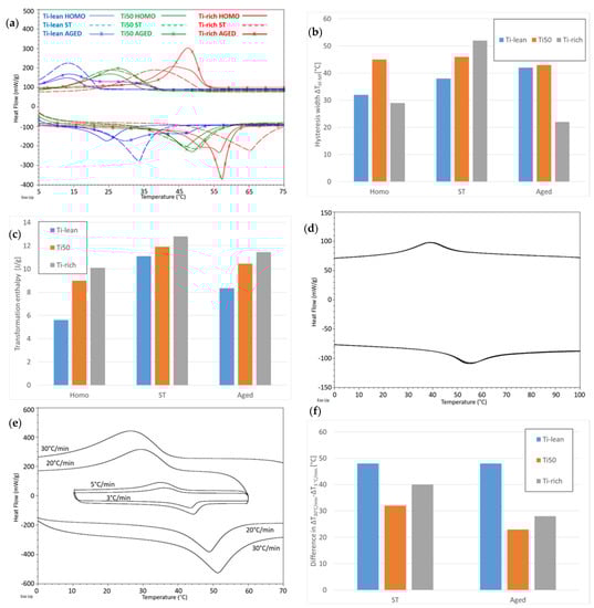 DSC results of group A alloys: (a) An overview of DSC curves after various heat treatments; (b) The hysteresis width of heat-treated alloys; (c) Enthalpy of transformation measured as the average of the forward and backward transformation; (d) A representative curve of the homogenized Ti50.2Ni30.9Cu9.0Pd9.9 exposed to ten DSC cycles; (e) A representative curve of solution-treated Ti50.0Ni29.1Cu11.5Pd9.4 cycled at different thermal rates ranging from 3–30 °C/min; (f) The growth of the hysteresis width by testing at 30 °C/min compared to 3 °C/min (ΔT30°C/min − ΔT3°C/min).