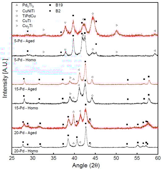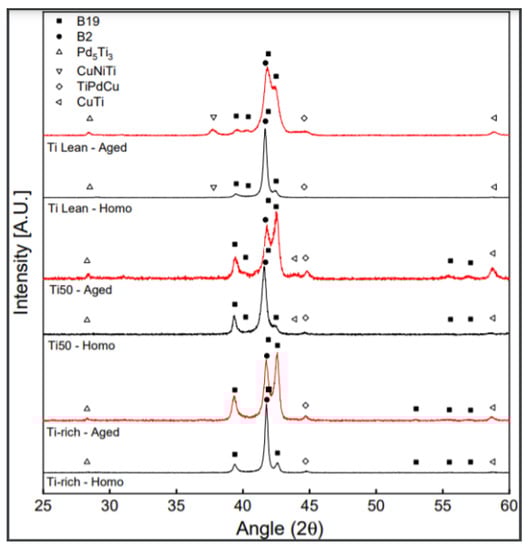The alloys contain several crystallographic phases at room temperature: B19 orthorhombic martensite, B2 cubic austenite and various tetragonal precipitates with different ideal stoichiometries (Pd5Ti3, CuNiTi, TiPdCu, CuTi). In all three alloys, Pd5Ti3, TiPdCu and CuTi phases are observed, while CuNiTi is only detected in the Ti-lean one. Due to the low furnace-cooling rate in the homogenization treatment, several precipitates are already present in the alloys prior to aging. However, after the solution treatment and subsequent annealing, the peaks of the tetragonal phases become much more evident, and the fraction of secondary phases significantly augments.. At a first glance, as the B2 [110] reflection is located around 41.8°, the samples seem to contain a significant amount of B2 austenite phases, and the ratio of B19 martensite to cubic B2 austenite increases after aging in correspondence to the increase in transformation temperatures reported in Table 2. However, this observation is counterintuitive to the DSC results presented in Figure 1, which demonstrated all samples—especially the Ti-rich sample—to be in a martensitic state at room temperature. In addition, a high quantity of residual B2 austenite is improbable, as the high transformation enthalpies values in Figure 1c indicate that samples transform completely and other B2 reflections in XRD spectra seem to be absent. It is known from ternary Ni-Ti-Cu alloys that there is a partial superposition of the B2 [110] and the B19 [020] peak [33]. For these reasons, we expect only a low quantity of residual B2 present in the samples, while the mere quantity of the peak is attributed to the B19 [020] planes reflections. The identification becomes even more difficult, as based on the content of the heavy Pd atoms, peaks are shifted increasingly to lower angles, rendering calibration procedures more complicated. However, it would be out of scope to quantify the B2:B19 ratio in this XRD study, which had the primary target of identifying precipitate phases and excluding the presence of other martensite morphologies (such as B19′) in the alloys.