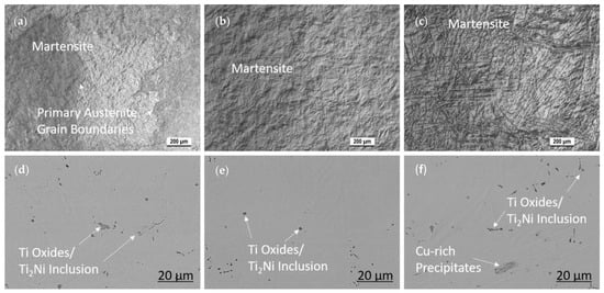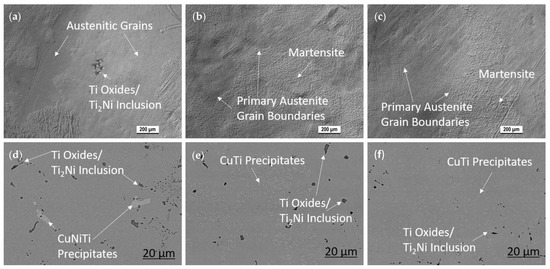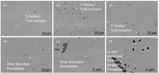 The microstructure of the VIM cast alloys shown in Figure 3 consists of austenitic grains in the 100 µm–1 mm range in which, based on the transformation temperatures (c.f. Table 2), different quantities of martensitic twinned areas are observed at room temperature—the least in Ti-lean alloy (Figure 3a). All alloys contain some Ti-oxides and Ti2Ni inclusions, which were not revealed by XRD due to their small, localized amount. The higher resolution and back scattering contrast in SEM analysis reveal differences in the precipitation behavior of the alloys. In the Ti-lean (Figure 3d), only a few micron-sized, macroscopic Cu-rich precipitates are observed, which are sparsely distributed in the vicinity of the grain boundaries. The matrix seems free of macroscopic phases that can be revealed at these resolutions. On the other hand, in the Ti50 (Figure 3e) and Ti-rich alloy microstructure (Figure 3f), only finer, homogenously dispersed precipitates are present. Pd-rich precipitates, such as Pd5Ti3, which were identified by XRD (Figure 2) in all alloys, remain at the nanoscale and thus cannot be visualized by FE-SEM.