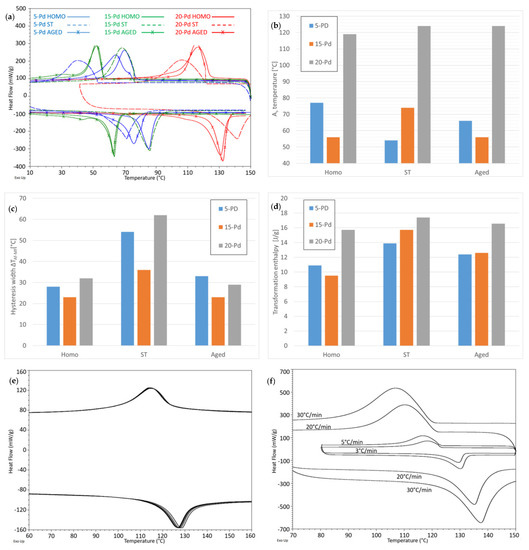 DSC results of alloy group B: (a) An overview of DSC curves after various heat treatments; (b) The austenitic transformation start temperature As of heat treated alloys; (c) Hysteresis width of heat treated alloys, hysteresis is measured as difference between austenitic finish and martensitic finish temperature; (d) Enthalpy of the transformation measured as average of forward and backward transformation; (e) A representative curve of homogenized 20-Pd exposed to ten DSC cycles; (f) A representative curve of solution-treated 20-Pd cycled at different thermal rates ranging from 3–30 °C/min (ΔT30°C/min − ΔT3°C/min).