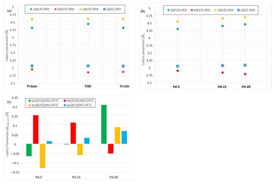 Lattice parameters, as measured by XRD, for alloys of group A and group B are shown in Figure 9a,b, respectively. Despite group A alloys being designed for fulfilling precisely the cofactor condition CC I, the geometries of the B19 cell vary significantly, which is another way to illustrate the sensitivity of the system to the composition. On the other hand, in the case of group B alloys, where Pd substitutes for Ni, clear trends for lattice parameters are observed as the cell volume increases with the content of Pd.