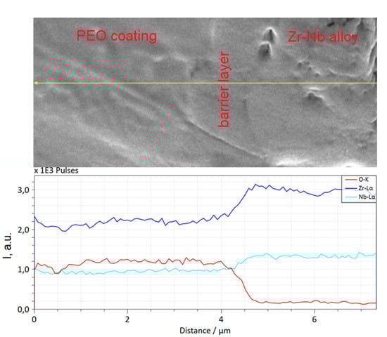 - Apelfeld, A.V.; Borisov, A.M.; Krit, B.L.; Ludin, V.B.; Polyansky, M.N.; Romanovsky, E.A.; Savushkina, S.V.; Suminov, I.V.; Tkachenko, N.V.; Vinogradov, A.V.; et al. The study of plasma electrolytic oxidation coatings on Zr and Zr-1% Nb alloy at thermal cycling. Surf. Coat. Technol. 2015, 269, 279–285. [Google Scholar] [CrossRef]