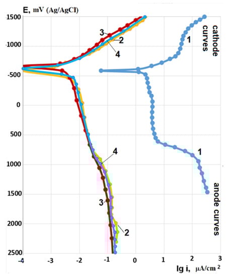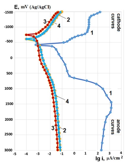 | Sample | Corrosive Medium | i, μA/cm2 at 0 V (Ag/AgCl) | lgi, [μA/cm2] |