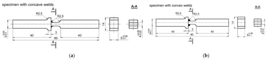 The experimental tests were carried out on samples welded without heat treatment and on samples after two different heat treatments. The first heat treatment was performed by subjecting the samples to annealing at the temperature of 630 °C for 2 h. However, the second heat treatment consisted of normalizing annealing at the temperature of 940 °C for 1.1 h [8,9,10,11,12,13,14,15]. Geometries of the tested samples are presented in Figure 1.