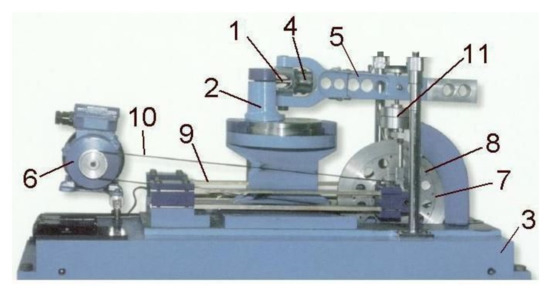 MZGS-100 machine, where: 1—specimen, 2—rotational head with a holder, 3—bed, 4—holder, 5—lever, 6—motor, 7—rotating disk, 8—unbalanced mass, 9—flat springs, 10—driving belt, 11—hydraulic connector.