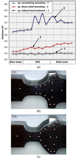 - The highest material hardness was measured on specimens without heat treatment in HAZ, and the lowest in specimens after normalizing annealing;