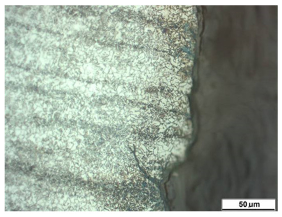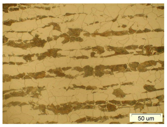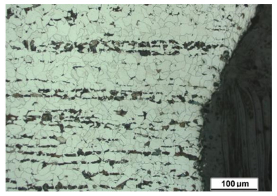 The metallographic tests of the base material confirmed the ferritic–pearlitic microstructure with a band pattern (base—Figure 5). The base material was characterized by ferrite grains with a diameter of 5 to 40 µm and similar grain sizes of perlite with a diameter of 5 to 45 µm.