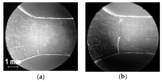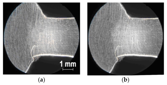 Exemplary fatigue crack path is shown in Figure 11 for a specimen with concave welds (without HT) and in Figure 12 for a specimen with convex welds under bending (without HT). During experimental tests, the crack initiation occurred on one side of the sample, most often on the upper surface and less often on the lower surface. A single crack propagated to a certain value, after which a crack also appeared on the other side of the sample.