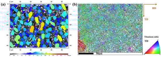 It can be seen from Figure 1a that the microstructures of the as-received TB6 bar are bimodal with 67% equiaxed α grains uniformly embedded in a β matrix. It was a forged billet experiencing multiple forging/annealing loading routines in single β and dual (α + β) domains. The average size of equiaxed α grains was near 3 μm. Figure 1b indicates the orientation map of the β phase in a cross-section microstructure. It can be seen that the local texture of the β phase is significant according to the orientation distribution of the β phase. The β microstructure is commonly found in the deformed near-β titanium alloy [27].