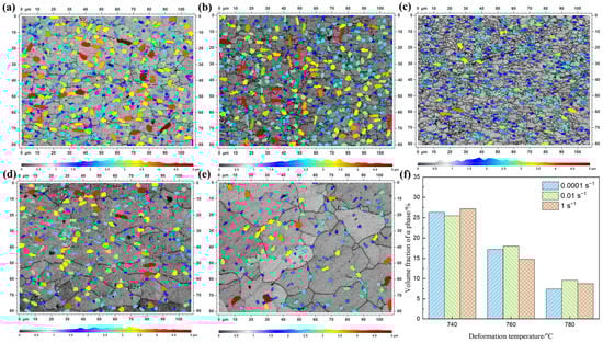 The α grain sizes spread under different deformation conditions: (a) 740 °C/0.0001 s−1; (b) 740 °C/0.01 s−1; (c) 740 °C/1 s−1; (d) 760 °C/0.0001 s−1; (e) 780 °C/0.0001 s−1; and (f) the variation of α volume fraction with deformation conditions.