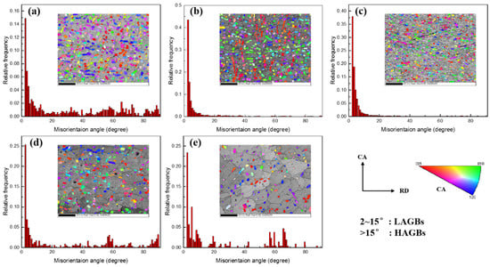 The α phase evolution is further analyzed by incorporating the crystallographic and morphologic information. Figure 4 shows the IPF maps of the α phase and the corresponding distribution of grain boundary misorientation in the α phase of the deformed microstructure at different deformation conditions. It is worth noting that the high-angle grain boundaries (HAGBs) occupy the certain proportion at the strain rate of 0.0001 s−1, as shown in Figure 4a,d,e. The fractions of low-angle grain boundaries (LAGBs) in the α phase are higher than that of the HAGBs at the strain rates of 0.01 s−1 and 1 s−1, as indicated in Figure 4b,c. The result indicates that the deformation would make new LAGBs and HAGBs in equiaxed grains. Additionally, the generation of LAGBs would be accelerated with the stain rate increasing.
