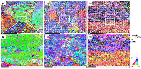 The IPF maps of the β phase in TB6 alloy deformed at 740 °C and varied strain rates: (a,d) 0.0001 s−1; (b,e) 0.01 s−1; (c,f) 1 s−1.