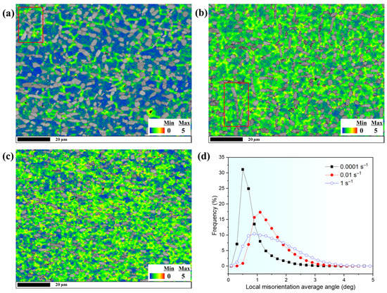 The Kernel average misorientation maps (KAM) are calculated to investigate the geometrically necessary dislocations accumulated during hot deformation, which could reflect the local strain of different regions. As seen in Figure 6a–c, the regions colored with green and yellow expand with the strain rate increasing, which reflects the internal deformation and resultant microstructure evolution behavior. Notably, the KAM value is usually higher in the β/β boundaries and α/β phase boundaries, seen by comparing the IPF maps (Figure 5) and KAM maps (Figure 6). The high KAM values in the β/β boundaries can be attributed to the bcc crystallographic rotation and slip system activation. Additionally, under the strict Burgers orientation relationship, the slip transmission would be hindered at the α/β phase boundaries, leading to the high KAM values here. Figure 6d histogram illustrates the distribution of local misorientation average angles at different strain rates. It reflects the accelerated deformation hardening progress as the strain rate increases, which also demonstrates that the geometrically necessary dislocation (GND) evolution is closely related to plastic deformation and microstructural evolution. The evolution of the GND density could be reflected by the average KAM values. Therefore, the average KAM values are calculated. By calculation, the average KAM values in Figure 6a–c are 0.82, 1.43, and 1.58 (degree). It can be seen that the GND density would increase appreciably as the strain rates increased from 0.0001 s−1 to 0.01 s−1 and fluctuate slightly as the strain rates increased from 0.01 s−1 to 1 s−1.