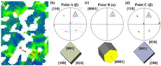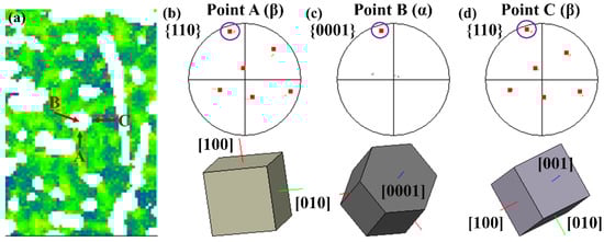 The local areas identified by a red square marked in Figure 6a are enlarged in Figure 7a, as shown, where arrows A and C are the β phases, and arrow B is the neighboring α phase separated by the α/β phase boundaries. Differently, the KAM value in A is higher than that in C, and this varied misorientation along the α/β phase boundaries is common in other areas. In spite of this, the β phases at arrows A and C and the left adjacent α phase presented by arrow B obey the BOR well, as seen in Figure 7b–d. In Figure 7b,d, it could be explicitly observed that the bcc crystal structure in the adjacent β phase differs a lot, where the bcc crystal in C rotates 90 degrees about the [001] axis compared with the β phase in A. If this crystal rotation was motivated from deformation, it would give rise to the significant crystal orientation fluctuation, consequently producing the HAGBs inside the β phase here. However, no significant orientation fluctuation could be observed in Figure 5d. Therefore, the reason may be back to the variation selection during the α → β transformation process when the specimen was heating and holding. For the initial material that experienced hot forged processing in this paper, there are cumulative dislocations and defects in the microstructure. Therefore, the β variant selection may occur during the heating and holding before deformation, which consequently may affect the β phase evolution in hot deformation. Additionally, it can be seen that there is less deviation of the BOR between the β phase in arrow C and the α phase in arrow B, which reflects that the variation selection during the α → β transformation would affect the deformation of the β phase.