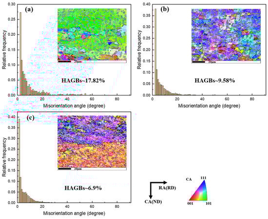 Distribution of the grain boundary misorientation in the β phase for the deformed microstructure and the corresponding IPF maps at different deformation conditions: (a) 740 °C/0.0001 s−1; (b) 760 °C/0.0001 s−1; (c) 780 °C/0.0001 s−1.