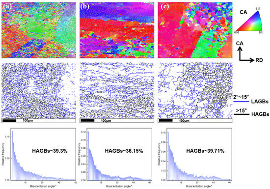 Distribution of the grain boundary misorientation in the β phase for the deformed microstructure and the corresponding IPF maps at different deformation conditions: (a) 740 °C/0.0001 s−1; (b) 740 °C/0.01 s−1; (c) 740 °C/1 s−1.