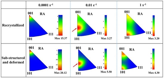 As shown in Figure 5 and Figure 10, the deformed β phase with a dynamic recovered state occupied a large fraction in the matrix, which may dominate the texture components and their intensity after deformation. According to Figure 5, the IPFs of sub-structured and deformed grains and recrystallized β grains were further calculated to analyze the β microtexture characteristics at different deformation conditions, which can be seen in Figure 11. From the above results, it can be observed that the β microtexture is significant. It can be interpreted by the fact that the β recrystallization would inherit the microtexture components of the sub-structured and deformation grains to some extent, and this phenomenon is more significant at the strain rate of 0.0001 s−1.