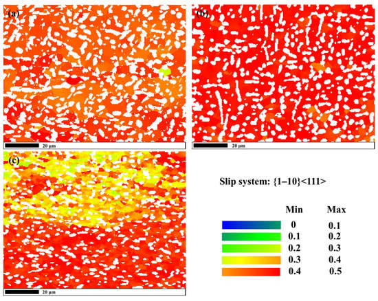 The operating of slip systems finally affected the microtexture intensity. During deformation, the activity of slip systems depends on the Schmid factor (SF) and the critical resolved shear stress (CRSS). For the β phase in titanium alloys, the {1−10}<111>, {11−2}<111>, and {12−3}<111> slip systems are perceived as the active ones at high temperatures. Among them, the activity of the {1−10}<111> slip system would result in a weak {001} and a sharp {111} texture; whereas the {11-2}<111> and {12-3}<111> slip systems tend to generate a {111} and {001} β texture, respectively [16,27]. Figure 12 shows the Schmid factor maps for the {1−10}<111> slip system, in which the SF value is calculated relative to the CA. The corresponding distributions of SF values for the {1−10}<111>, {11−2}<111>, and {12−3}<111> slip systems can be seen in Figure 13. At a lower strain rate, the {1−10}<111> slip system is highly activated, in which the SF value of the β phase is mostly larger than 0.4 (Figure 12a,b). However, as shown in Figure 12c, there is a significant differentiated distribution of the SF value in the two regions (the two adjacent initial β grains). The SF values in the top region of the image are commonly less than 0.4, which is more significant within the un-recrystallized β grains.