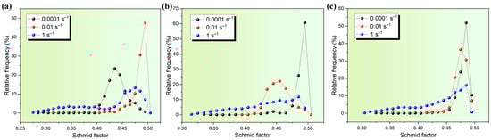 Schmid factor maps for the {1−10} <111> slip system of TB6 titanium alloy deformed at 740 °C and different strain rates: (a) 0.0001 s−1; (b) 0.01 s−1; (c) 1 s−1.