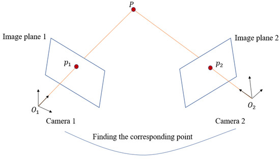 The stereo vision system shown in Figure 1, or a two-camera system with different perspectives, plays an important role in the DIC measurement system. A space point p is recorded simultaneously by two cameras on the image plane with a different perspective. The points p1 and p2 on the image plane of the two cameras are then matched using the DIC matching algorithm, and the 3D coordinates of point p can be recovered based on the geometry of the stereo-vision system.