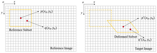 The core idea of the DIC method is to measure displacement and strain information on an object’s surface by matching and tracking feature points in the natural texture or artificial speckle pattern before and after deformation. The DIC matching process obtains the coordinate on the target image after deformation corresponding to a known coordinate position on the reference image taken before deformation. It is usually necessary to divide the image into multiple grids, or subsets, and the deformation of the subset is used to represent the deformation of the local area of the object. Figure 2 shows this principle. On the reference image, a rectangle with a size of (2M + 1) pixel × (2M + 1) pixel and point at the center is taken as the reference subset. A correlation function is then used to find a subset on the target image with a similar distribution to that of the reference subset. The subset with the largest correlation coefficient is considered the deformed subset. The sum squared difference correlation criterion (SSD) is commonly used to evaluate the similarity between subsets [20]. Assuming that the intensity distribution of the two facets is represented as and, the SSD function has the following form: