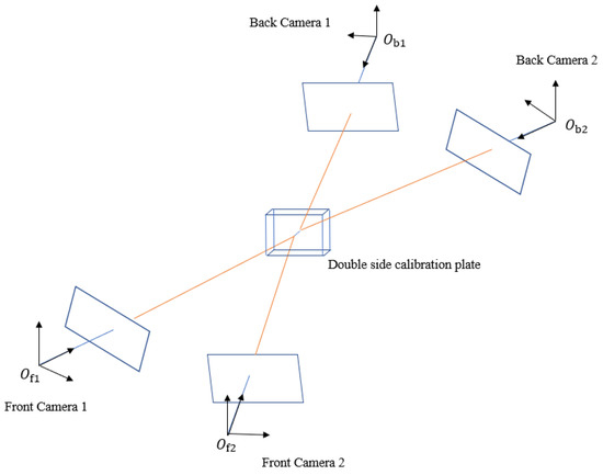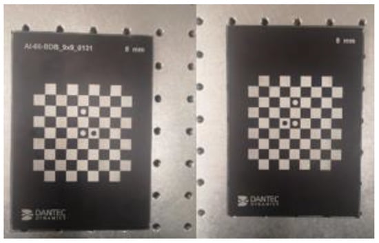 The double-sided calibration strategy uses a double-sided calibration plate to calibrate the front and back dual-camera DIC systems simultaneously. The schematic of the double-sided calibration strategy is shown in Figure 3. Figure 3 shows two typical two-camera stereo vision subsystems, and these two subsystems are linked through calibration. Figure 4 shows the design of the calibration plate. The role of this calibration is to connect these two subsystems into one single global system. The world coordinate system of the front camera is taken as the reference global coordinate, and the back camera coordinate system is transformed to the reference global system. This transformation can be expressed as follows: