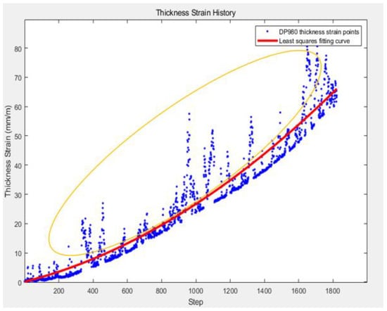 The measurement of the thickness strain is the core part of calculating the R-value. Li built a dual-camera DIC system on the front and back of the test piece to realize the non-destructive measurement of a sample’s thickness strain [19]. However, as Li wrote in [19], the strain measurement results contain noise, so it is necessary to remove the noise from the strain data. Since the thickness of the test sample is usually a few millimeters, the noise is amplified during the thickness strain measurement. Figure 5 shows the DP980 thickness strain history, where the x-axis represents the number of photos taken and the yellow circle indicates the noise data. Two smoothing algorithms, namely the Least squares algorithm and Random sample consensus (RANSAC) algorithm, were used to fit the curve and reduce noise. A comparison of the results using these two algorithms follows.