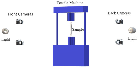 The experimental system is shown in Figure 8 and Figure 9. Four GigE cameras (maximum resolution 2752 × 2200) were used to form two independent DIC binocular measurement systems. One DIC system was placed in front of the test sample, while the other DIC system was placed behind the test sample. Two pairs of 50 mm fixed focus lenses were used to achieve a 20 mm × 20 mm field of view. The spatial resolution was 0.08 mm/pixel and the acquisition rate was 10 Hz. Two powerful LED lights provided sufficient illumination for the front and back DIC measurement systems. A 50 KN MTS tensile test machine was used to do the tensile test, and a 1 mm thick dog bone shape sample made from DP980 sheet metal was prepared for the test. The tensile speed was set at 3 mm/min. The slow tensile rate used for the test enabled more images to be taken before the sample cracked, thus providing more data to analyze. Figure 10 is a schematic diagram of this sample. Current limitations with this system include the cost of the cameras used for the DIC systems and the large amount of space required to accommodate the front and rear camera groups.