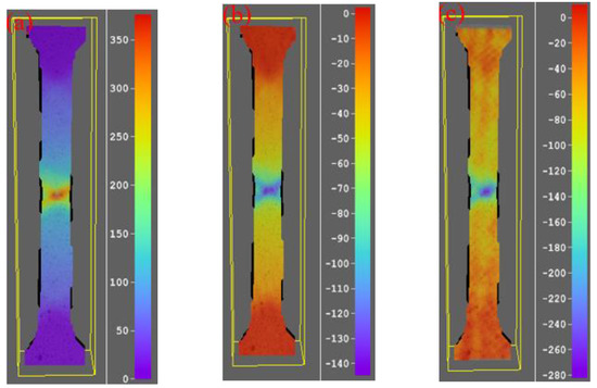 Full field strain distribution of sample surface measured by DIC system: (a) distribution of length strain; (b) distribution of width strain; (c) distribution of thickness strain.
