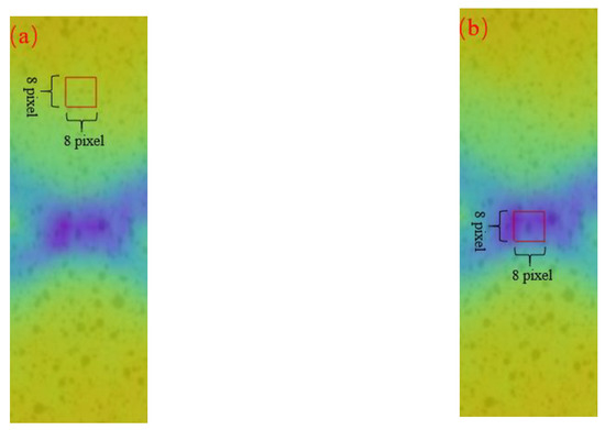 A square area of 8 × 8 pixels, as shown in Figure 12a, was selected instead of a single point in the non-necking area to reduce the influence of noise on the data. Each pixel represents 0.2 mm. The calculation results for the traditional and proposed methods are shown in Figure 13. According to the definition of R-value, the R-value for DP980 is equal to the slope of these two curves. It can be seen from the figure that the relationship between thickness strain and width strain is approximately linear, and the amount of noise in the data is low. Therefore, the least squares principle can be used to calculate the slope of the two curves. The directly measured R-value is 0.8546, while the indirectly measured R-value is 0.8656. Based on previous research of the properties of DP980 material, its R-value generally ranges between 0.7–1.0, depending on the material’s composition [24]. The results measured by both methods can be considered reasonable because they both fall within this range, and the difference in the results between the two methods is very small. Therefore, both methods are acceptable.
