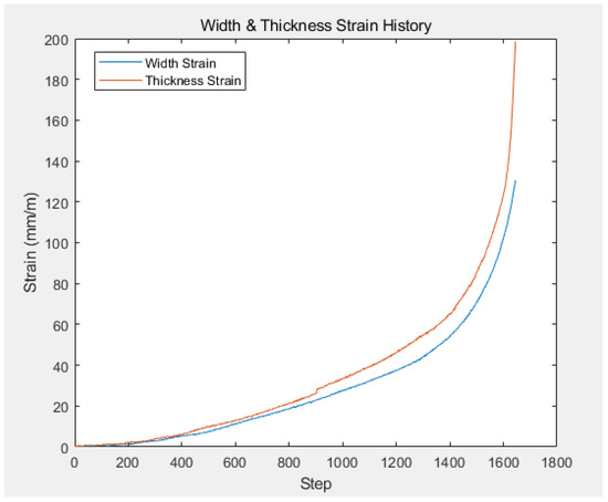 When necking occurs during a tensile test, a large amount of strain is disproportionately distributed in a central location of the material. As the deformation continues, the strain in the necking area continues to increase until the material ruptures. In the necking stage, the cross-sectional area of the material decreases drastically, while the strain in the thickness and width directions increases sharply. Figure 14 displays an example of the sharp strain increase that can occur during the necking stage.