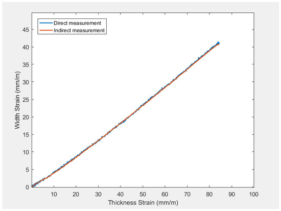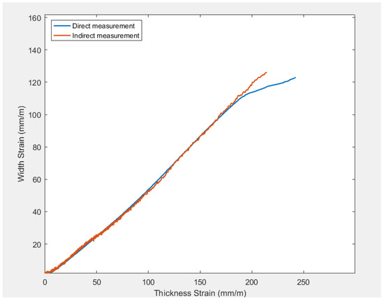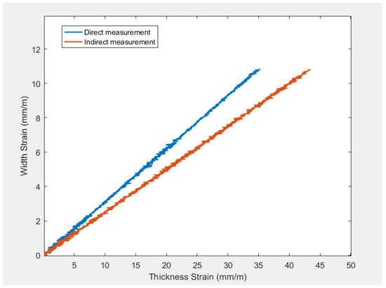 The other method used is the direct measurement method, or the direct thickness strain measurement method proposed in this paper. The calculation method is shown in Equation (8). Data in both the non-necking and necking area was selected for analysis to better show the difference between the two measurement methods.
