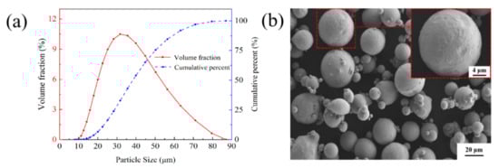 The materials are Cu–Cr–Zr alloy powders made by gas atomization, produced by Jiangsu Vilory Advanced Materials Technology Co., Ltd., Xuzhou, China, and the chemical compositions are listed in Table 1. The size of the virgin powder is measured by a laser particle size analyzer (Master sizer 3000, Malvern Instrument Ltd., Malvern, UK). As shown in Figure 1a, the particle size distribution of the powders exhibits a nearly normal distribution ranging from 15 μm to 53 μm with an average size of 36.8 μm, which is beneficial for improving the apparent density of the virgin powder. The scanning electron microscopy (SEM) image of the powders in Figure 1b shows a few satellite particles around the powders and most of the nearly spherical powders have good fluidity, which is conducive to the deposition of a homogeneous powder layer during the LPBF process. The specifications of 316L stainless steel substrate are 125 mm × 125 mm.