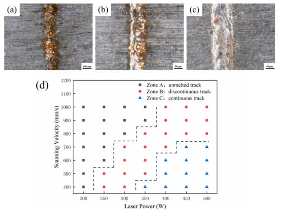 Three typical track types of (a) unmelted track, (b) discontinuous track, (c) continuous track and (d) the process map of single tracks.