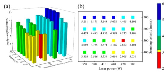 A two-dimensional plane is composed of many single tracks. Two adjacent single tracks contact each other to produce the overlap area and the remelting expansion area. The height between this area and the melting channel determines the quality of the overlap [32,33]. Therefore, the surface roughness can be used to evaluate the quality of single plane formed under different process parameters. The laser power and the scanning velocity range of the continuous single track are selected for the single plane forming experiments. The process parameters are listed in Table 3. The domestic JD 520 surface roughness measuring instrument is used to measure the surface roughness of the single plane under different process conditions. The scanning path of the probe is perpendicular to the direction of laser scanning. When laser power is 470 W and scanning velocity is 500 mm/s, the minimum surface roughness is 2.852 μm, and the value below the square indicates the surface roughness of the single plane in Figure 3.