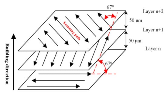 During the LPBF process, the working chamber is filled with argon to ensure that the volume fraction of oxygen is less than 0.06%, and the substrate is preheated to 200 °C. Because the particle size of the virgin powder ranges from 15 μm to 53 μm, the thickness of powder spreading layer is set to 50 μm. In addition, Figure 4 indicates that alternate scanning with 67° interlaminar commutation can effectively alleviate the thermal stress concentration and reduce the possibility of deformation and warpage.