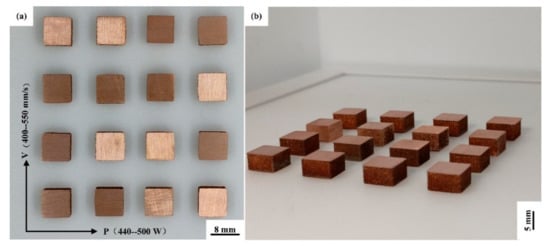 (a) Top view and (b) horizontal view of Cu–Cr–Zr alloy cuboid samples fabricated by LPBF.